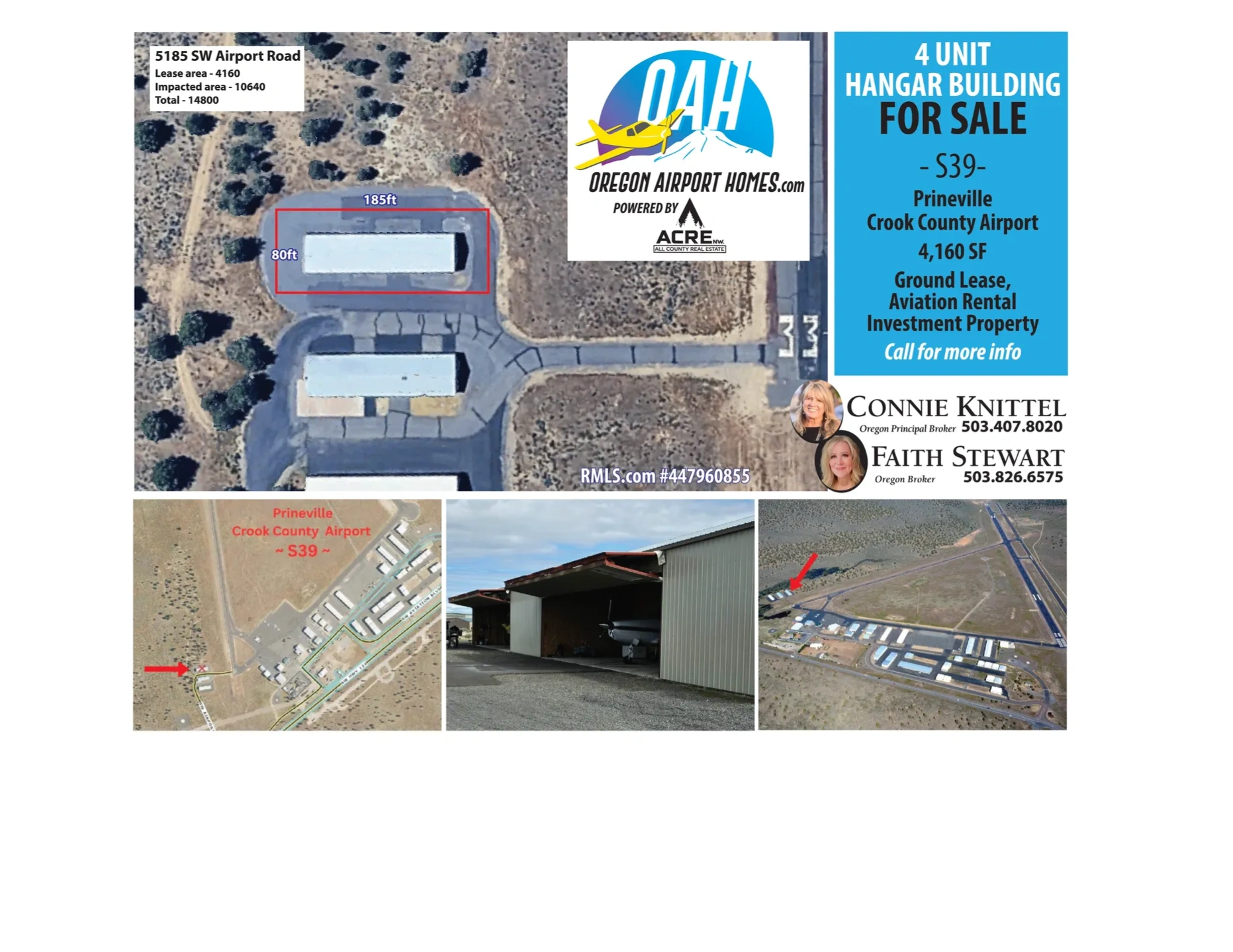 "Bank" of 4 hangars possible. Prineville downtown is a desireable location of safe community lifestyle.